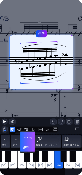共同制作者を招待して、リアルタイムに作曲できます。複数のユーザーが、デバイスをまたいで同じ楽譜を同時に記譜・編集できます。